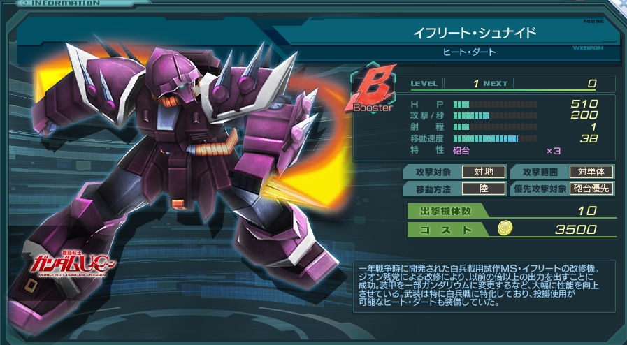 スペック的にはシグーの上位機種。 しかし、本機のみの特徴として攻撃間隔が1.5秒に劣化している。(ダメージ表示は1.5倍になる) それゆえ防衛施設への攻撃が遅い(ヒートダートの構えモーションもあるため尚更遅い) このせいで砲台特化機体なのに迫撃砲台にめっぽう弱い。 プトレマイオス等での回復を見誤るとすぐ蒸発するので注意。