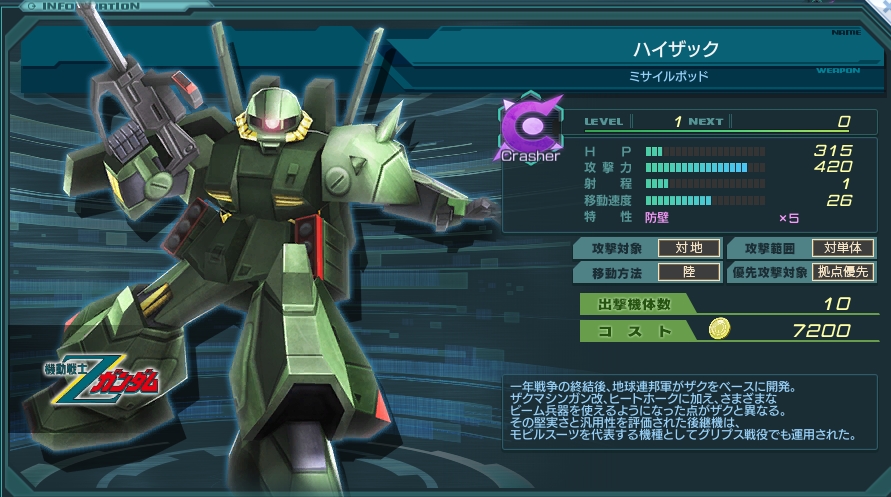 ジンと本機のどちらかが最初に入手するであろうクラッシャータイプの機体 クラッシャータイプは防壁破壊特化・拠点優先になっておりレベル2以下の防壁なら一撃で破壊してくれる 同時期開発のジンと比較すると、HPと移動が若干低いが誤差程度の差、攻撃力はかなりの差があり出撃機体数も多めだが出撃コストは倍以上必要となっている。 相手戦力や配置と相談して使い分けたほうがいいだろう。 また生産優先系と同じで最短距離にエースがいるとそちらを優先するので、地上エースキラーとしても運用が可能 逆に言えば壁を掘ろうとしているのにエースに吸われて壁を掘らずに犬死なんてことも起きるので、置くときは周りに注意。