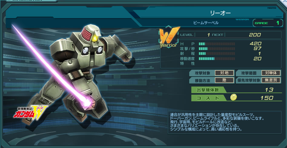 • グレード9リーオー50:HP2112、攻撃720、射程1、移動20、機体数18、コスト20200