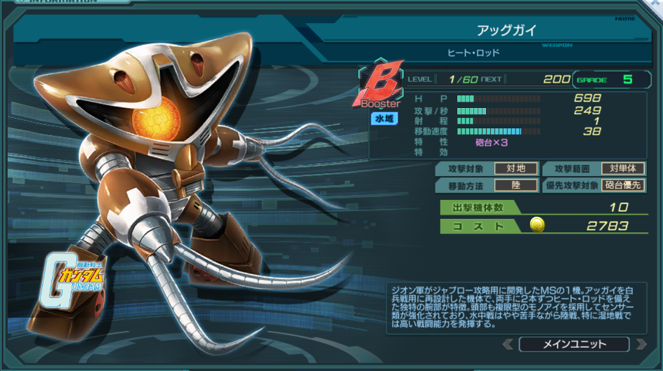 一覧 量産機 | エース | MA 最終ステータス 量産機 | エース | MA 比較データ エースGバースト | シリーズ別早見表 | 特性早見表| MS索引 赤字はレベルアップによるMAX値 基本ステータス