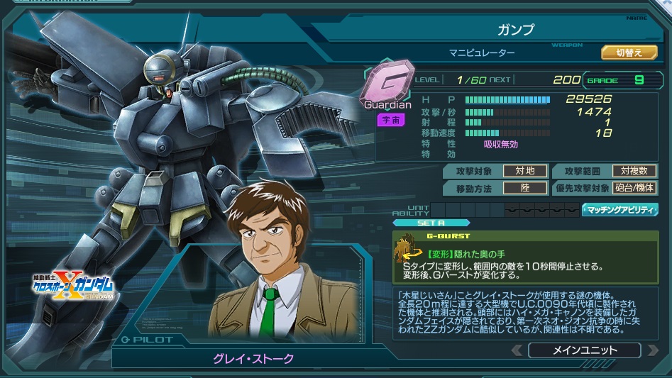 | Sタイプに変形し、範囲内の敵を10秒間停止させる。変形後、Gバーストが変化する。 | |||