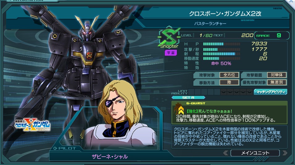 | 味方ACEと出撃すると一度だけ30秒間、通常攻撃と攻撃Gバースト からのダメージ上限:2500を得て、HPが回復する(750/1秒)。 | |||