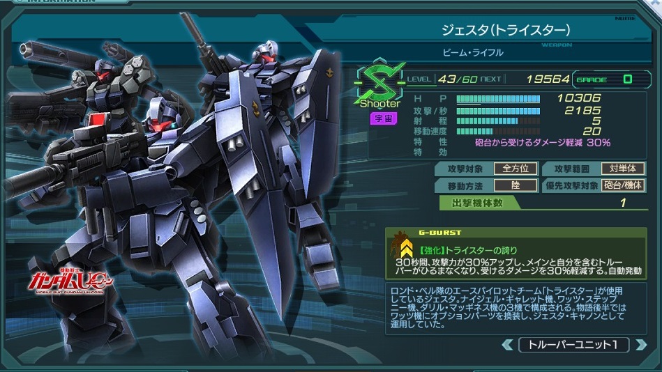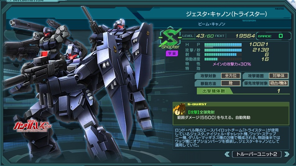 | Shooter | 特性 | 砲台から受けるダメージ軽減 30%、 メインのGバースト蓄積時間+50% | ||