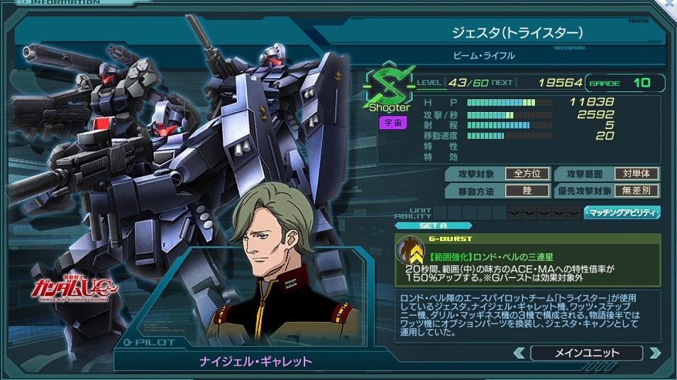 | 20秒間、範囲(中)の味方のエース・MAへの特性倍率が 150%アップする。※Gバーストは対象外 | |||