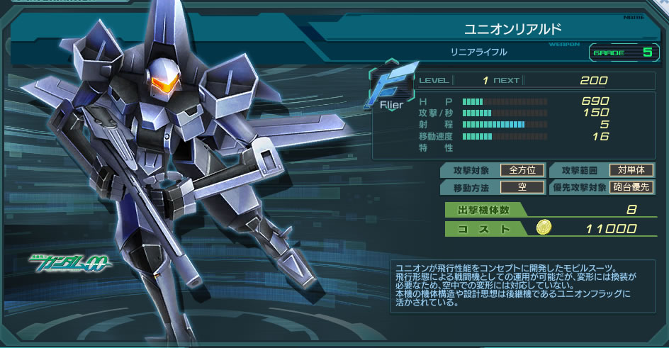 一番最初に入手可能な砲台優先のFlier型。射程5の機体の中で最速入手が可能な機体でもある。
