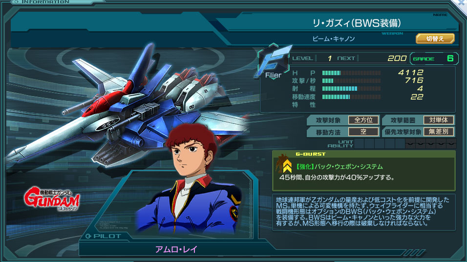 | GRADE | HP | 形態 | 攻撃/秒 | 攻撃表示値 | 修理時間 |