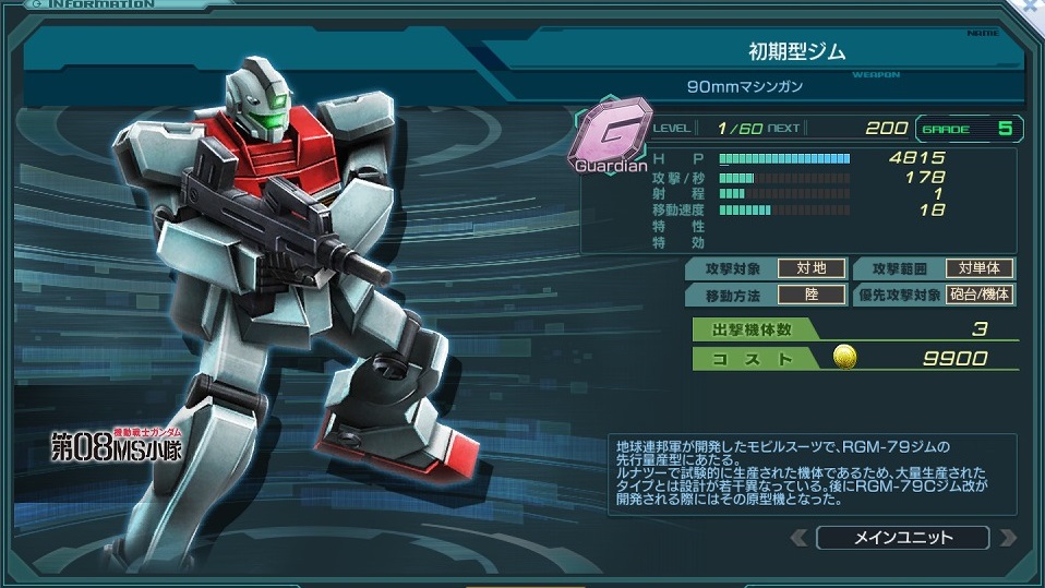 機体数が現行での全量産機中最大5機と最低数だが、HPは実現レベルであるLv.60で最高位をマーク。