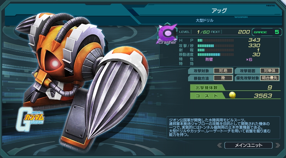 C型としては他の拠点優先機体数12機組のデナン・ゲーと比較して全てにおいて劣っている。