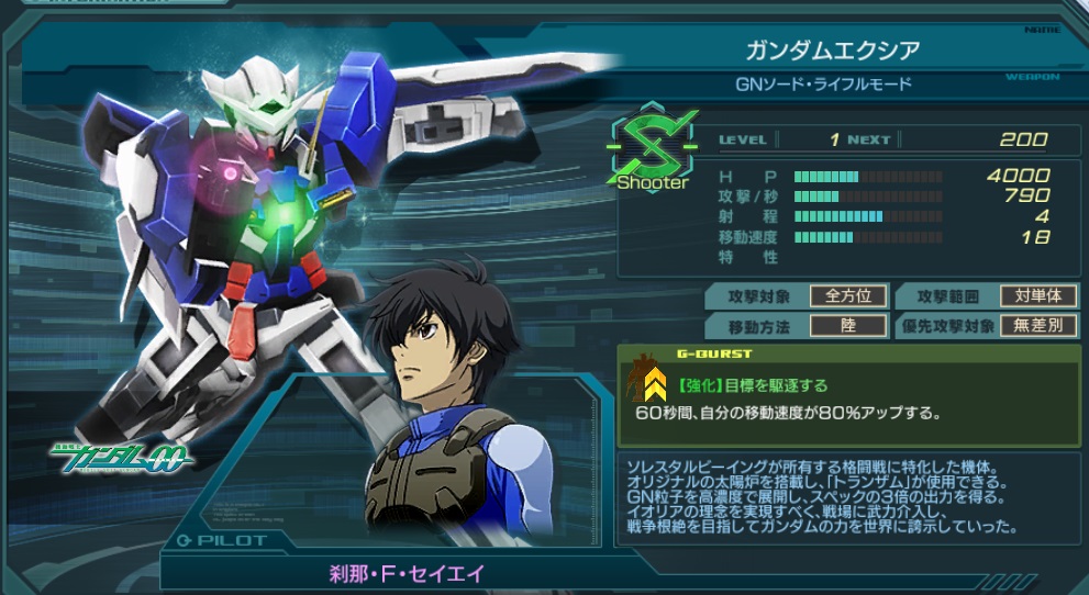 型式番号 GN-001 基本詳細はガンダムエクシア参照。 右前腕に装備された「GNソード」は刀身を折り畳むことで銃身を展開する「ライフルモード」にした状態。