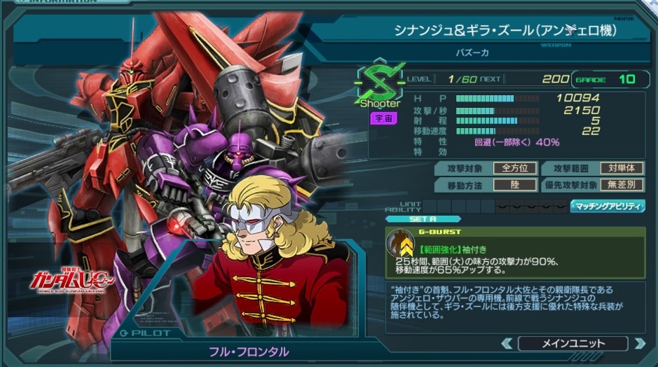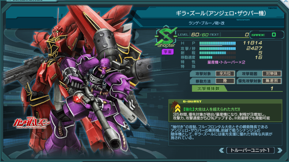 | HPの最大値が100%、回避(一部除く)、命中が40%アップし、 Gバースト効果時間が100%延長する。 | |||