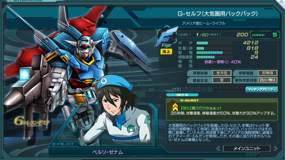 一覧 量産機 | エース | MA 最終ステータス 量産機 | エース | MA 比較データ エースGバースト | シリーズ別早見表 | 特性早見表| MS索引 赤字はレベルアップによるMAX値 基本ステータス