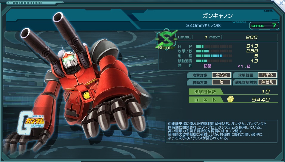 射程5・無差別のS型量産機。そして攻撃間隔1.5秒という特徴を持つ。 これにより一撃の火力が高い反面、オーバーキルが発生しやすいというクセがある。 代わりにスペックは攻撃力・HP共に高く、特にHPは盾役の選択肢に入る量産型νガンダムと並ぶ硬さを持つ。 また移動力は13とS型量産機中最鈍足だが、そのおかげでダガーLやZZガンダムなど最低速のG型機すら追い抜きにくく、 囮を追い越して事故死するケースはほぼ起きない。発射間隔の遅さは、この射程5としては驚異的な生存力でカバーしていきたい。 ただし、運用時は機体数が少ないことに注意すること。 ちなみに対防壁特性を地味に持つが、これが生きることはあまりない。ちょっとだけ壁で止まりにくい程度に考えよう。 なお、射撃時には原作でおなじみのあのキャノン発射音が鳴る。