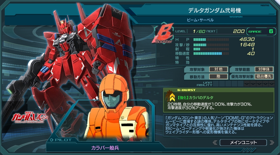 一覧 量産機 | エース | MA 最終ステータス 量産機 | エース | MA 比較データ エースGバースト | シリーズ別早見表 | 特性早見表| MS索引 赤字はレベルアップによるMAX値 基本ステータス