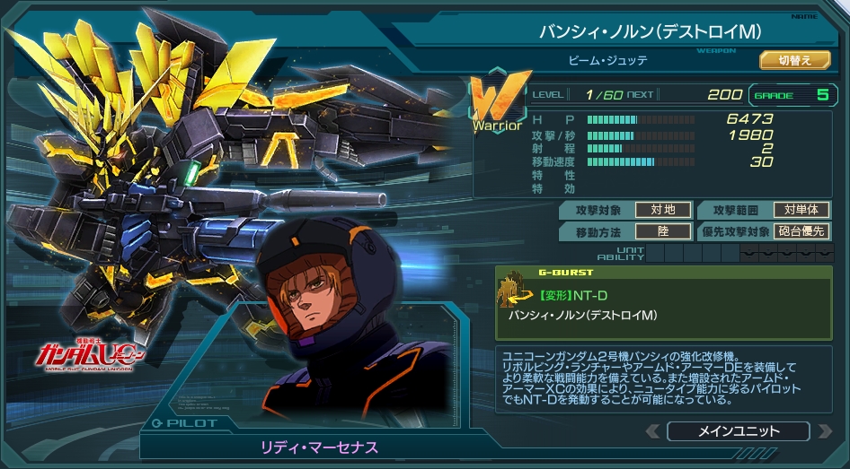 機体詳細画像はデストロイモードに変形済であるが、ユニット選択画面やユニット出撃時はユニコーンモードになっている。