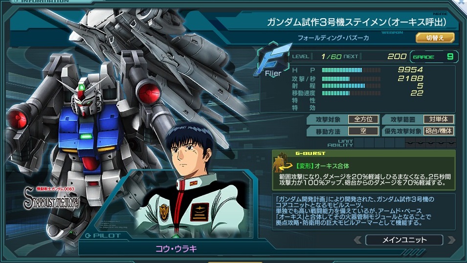 Gバーストはガンダム試作3号機(MA)に変形し、通常攻撃が広大な範囲攻撃となり、強化効果として攻撃力アップや特性+砲台ダメージ軽減などで
