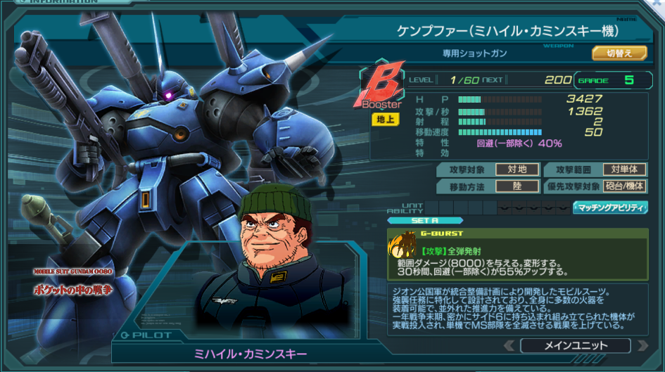 一覧 量産機 | エース | MA 最終ステータス 量産機 | エース | MA 比較データ エースGバースト | シリーズ別早見表 | 特性早見表| MS索引 赤字はレベルアップによるMAX値 基本ステータス