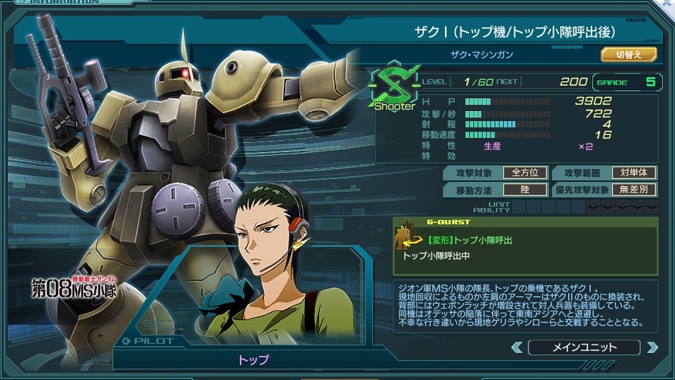 一覧 量産機 | エース | MA 最終ステータス 量産機 | エース | MA 比較データ エースGバースト | シリーズ別早見表 | 特性早見表| MS索引 赤字はレベルアップによるMAX値 基本ステータス