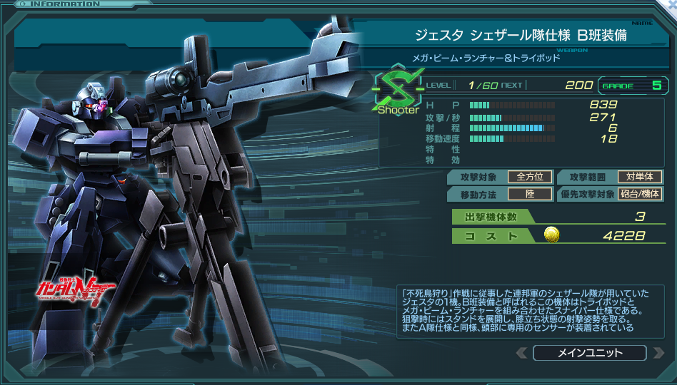 一覧 量産機 | エース | MA 最終ステータス 量産機 | エース | MA 比較データ エースGバースト | シリーズ別早見表 | 特性早見表| MS索引 赤字はレベルアップによるMAX値 基本ステータス