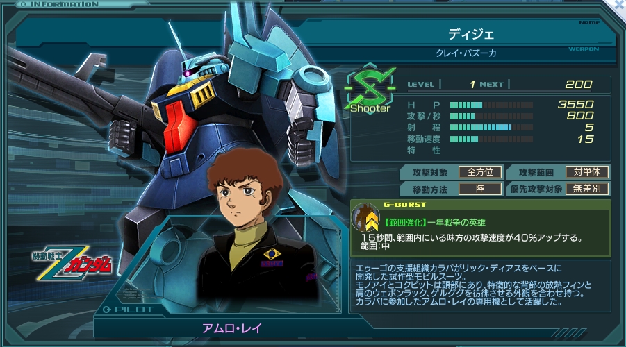 同盟タワー救援エース設定時はLv1扱い イベント報酬機体、ラボLv2相当の性能を持ったS型エース。 火力はGヘビーアームズ(EW版)以上、ガンダムヘビーアームズ改未満といった性能。 しかし、耐久面ではガンダムEz8未満と脆い。 特徴的なのはGバーストの溜め時間の短さ。 溜め時間は25秒と短く、持続時間こそ短いものの最初から出撃させれば3回以上の発動も可能である。 足回りが悪いためムラサメと一緒に出すよりは、ザクⅢと一緒のほうが活用しやすい。 同盟の救援エースレベルは、Lv1扱いになっているので、低コアレベル帯の救援エースとしては高性能で頼りになる。