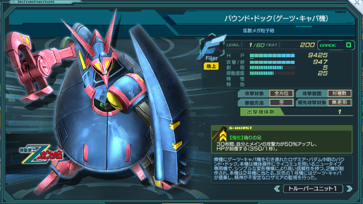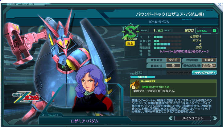 一覧 量産機 | エース | MA 最終ステータス 量産機 | エース | MA 比較データ エースGバースト | シリーズ別早見表 | 特性早見表| MS索引 赤字はレベルアップによるMAX値 基本ステータス