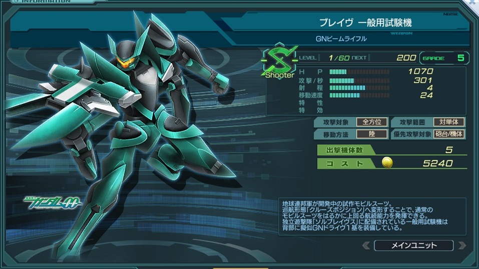 一覧 量産機 | エース | MA 最終ステータス 量産機 | エース | MA 比較データ エースGバースト | シリーズ別早見表 | 特性早見表| MS索引 赤字はレベルアップによるMAX値 基本ステータス