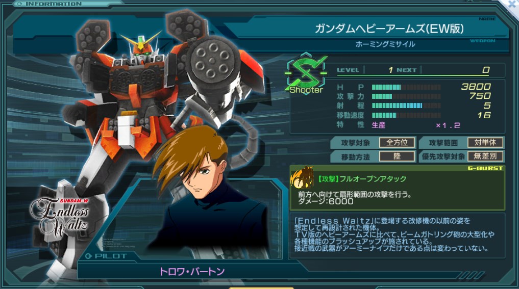 純粋にガンダムヘビーアームズを強化した機体。射程・移動速度もアップ。 攻撃間隔は2秒と遅い。一旦迫撃で怯みはじめると何もできなくなる。 Gバーストの範囲が180→90度に狭められて射程が伸びた為、ガナーザクW(ルナマリア)の上位互換に近い印象を受ける。 ただし、通常攻撃が肩部からのホーミングミサイルになったためか、攻撃速度が大幅低下し発射までに溜めが発生する。 この溜め中に怯みが発生すると攻撃がキャンセルされてしまうのがネック。 瞬間火力が6000に強化されたGバーストで防壁レベル5以下とその奥にある施設を同時に粉砕できる。 ただし奥行が伸びた代わりに横範囲が90度に狭まったので、大規模な水平防壁掘削はできなくなった。 また移動やひるみ等で変な方向に誤射しやすくもなっているので発射するときは注意。