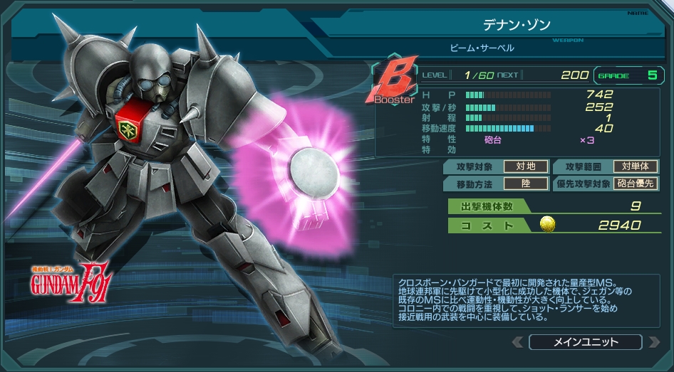 Lv60の砲台優先Booster型の中で比較すると、初の出撃機体数が13機まで増える機体。