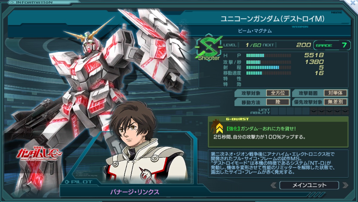 攻撃間隔1.5秒に射程5、Gバーストなど全般的にユニコーンガンダムGに非常に近い使用感覚を持つ機体。 しかもバースト蓄積の速さと強化効率から、火力はユニコーンGを上回る。