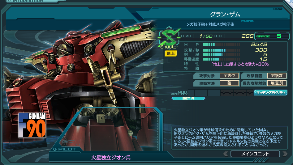 一覧 量産機 | エース | MA 最終ステータス 量産機 | エース | MA 比較データ エースGバースト | シリーズ別早見表 | 特性早見表| MS索引 赤字はレベルアップによるMAX値 基本ステータス