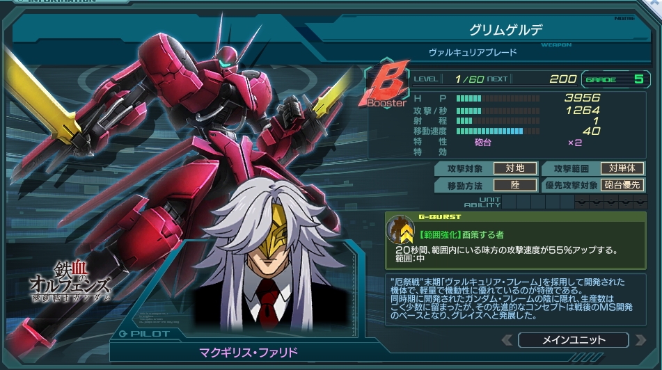| 出撃後15秒経過する度にGバースト効果時間が20%延長 ※延長効果はGバースト使用時の経過時効果を適用 | |||