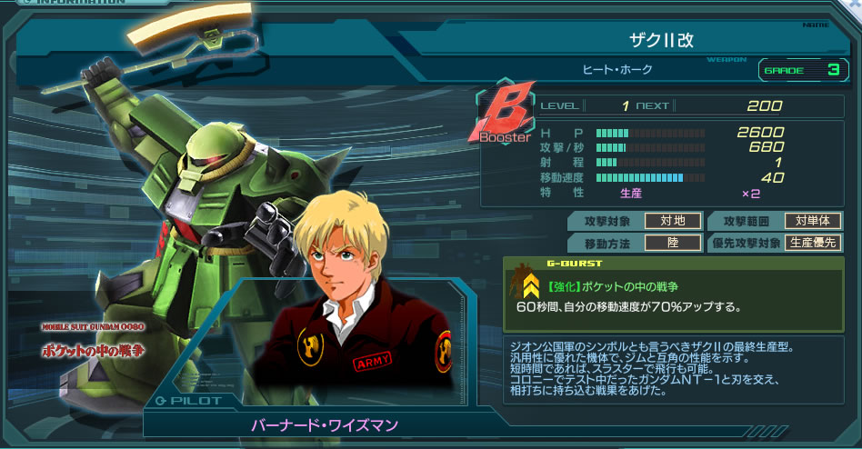 一覧 量産機 | エース | MA 最終ステータス 量産機 | エース | MA 比較データ エースGバースト | シリーズ別早見表 | 特性早見表| MS索引 赤字はレベルアップによるMAX値