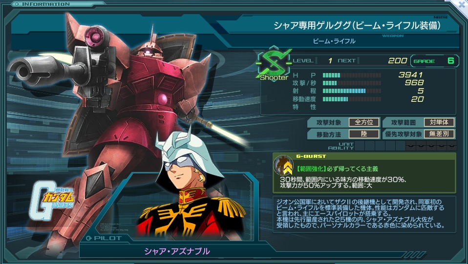 Gバーストが範囲強化大のShooterエース機で、方向性としてはガザC(ハマーン・カーン機)と似ている射程が4→5と1伸びている。