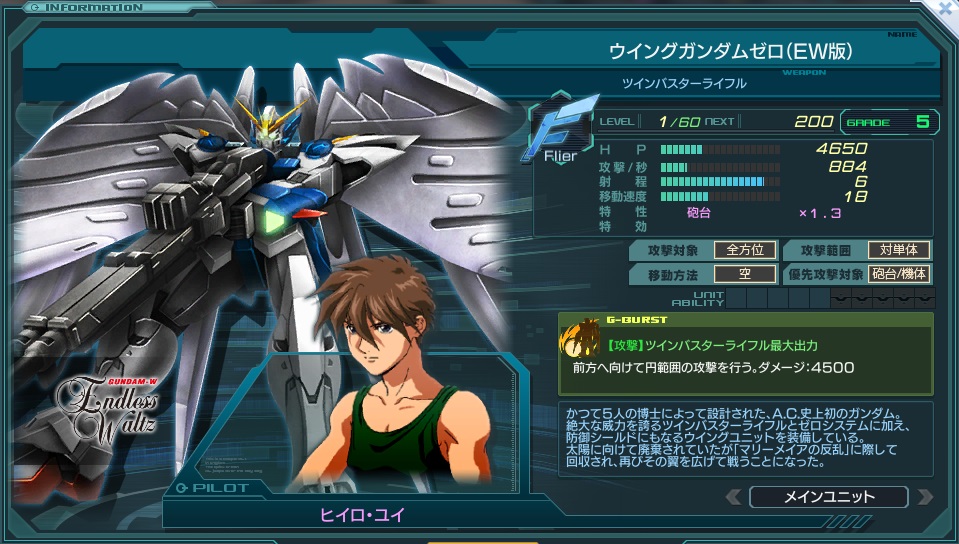 ウィングガンダム系列の伝統なのか本機も射程6で攻撃間隔が長いエースとなっているが、2秒間隔で2回攻撃のため単発ダメージは標準的。 カスタマイズ