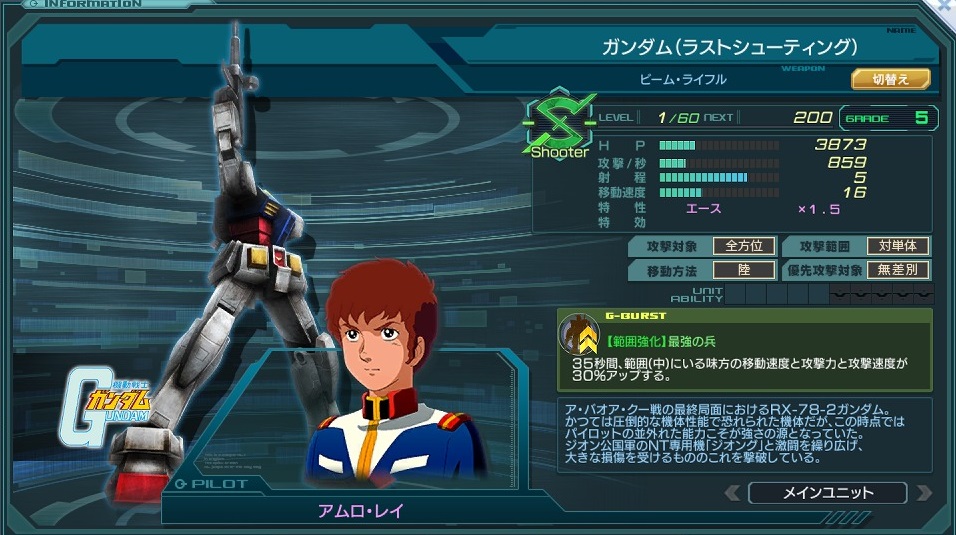 一覧 量産機 | エース | MA 最終ステータス 量産機 | エース | MA 比較データ エースGバースト | シリーズ別早見表 | 特性早見表| MS索引 赤字はレベルアップによるMAX値 基本ステータス