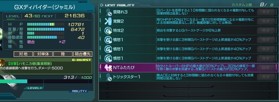 専用アビリティの「NTふたたび」は自身とトルーパーのHPを30%上昇し、敵の攻撃を30%の確率で回避、攻撃Gバーストの威力30%アップという三点を持つ。