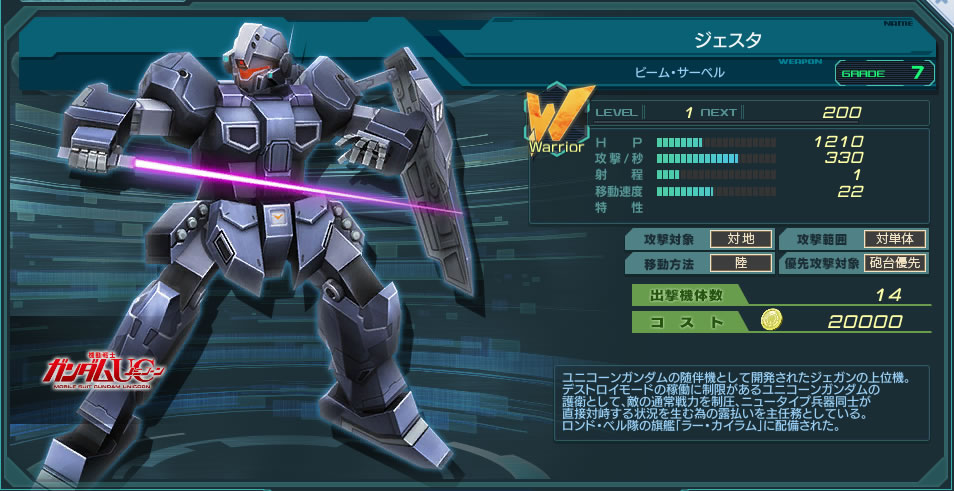砲撃優先でドムの上位互換機。スペックもザクウォーリアより高性能。 初期出撃数は14と陸戦型ジム、ドムよりも増えている。