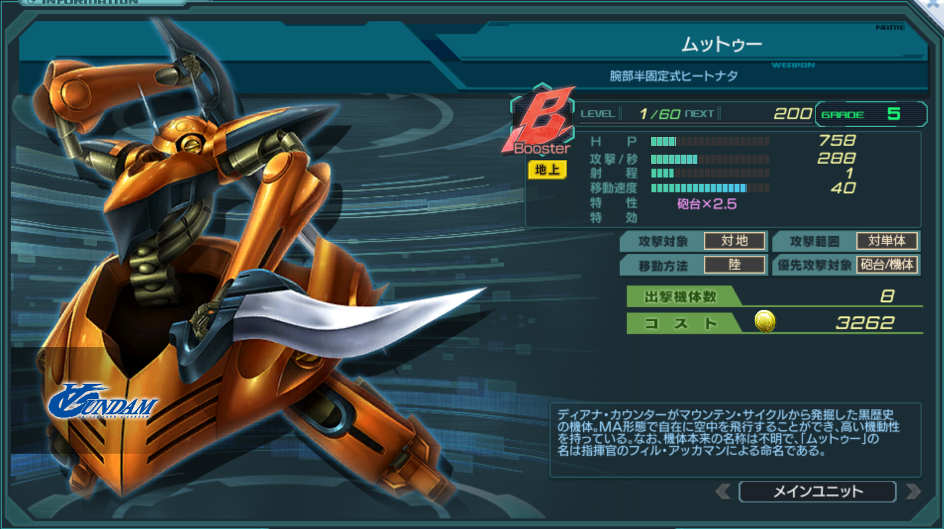 一覧 量産機 | エース | MA 最終ステータス 量産機 | エース | MA 比較データ エースGバースト | シリーズ別早見表 | 特性早見表| MS索引 赤字はレベルアップによるMAX値 基本ステータス