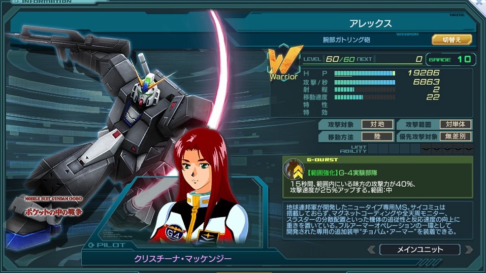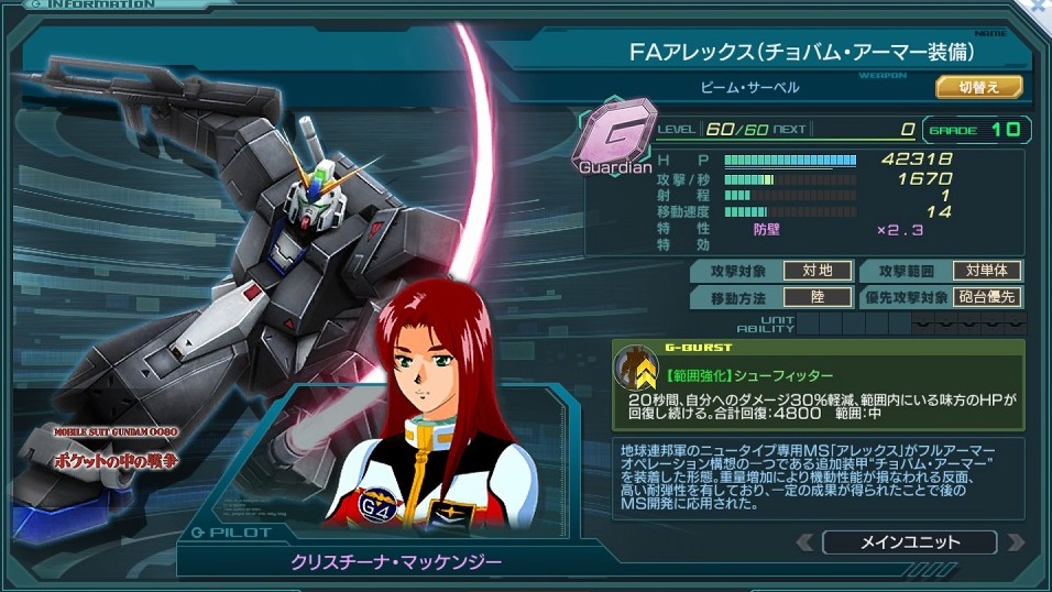 総HP面などで防衛にも優れ、分離前後共に範囲強化Gバーストと攻撃でも扱いやすいユニット。