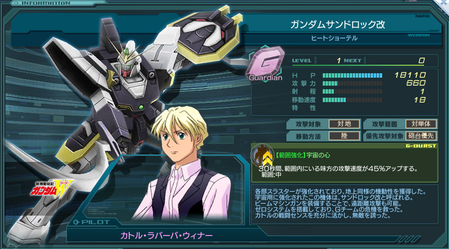 | Ⅱ | Lv3 | ガンダムサンドロック改 | G | 18110 | 660 | 1 | 18 | - | 砲台 | 【範囲強化】攻撃速度 | |