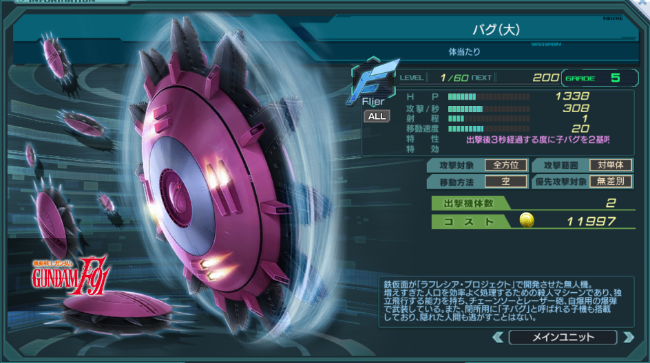 | Flier | 特性 | 出撃後3秒経過する度に子バグを2基呼び出す | ||