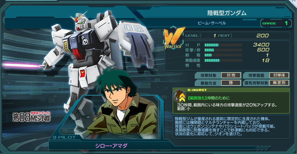 一覧 量産機 | エース | MA 最終ステータス 量産機 | エース | MA 比較データ エースGバースト | シリーズ別早見表 | 特性早見表| MS索引 赤字はレベルアップによるMAX値