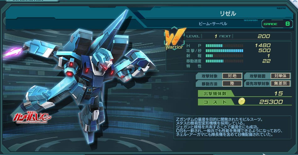 現状一番最後に製作できるW型。ザクウォーリアの上位互換。初期機体数も15と多い。 特性はないとはいえC型に匹敵する攻撃力と、耐久力も初期1480とG型のギラ・ズールを超える硬さがある。 デメリットも存在せず、行うべきこともいままでの経験を活かせば良いだけの良機体。 製作にはコアLv8と、Zガンダムの分を含めた40+25=65枚のレアチップが必要。 それでも最優先で作ることをオススメ出来る機体。