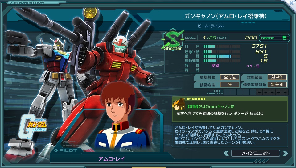 量産機版と同じく射程5かつ攻撃間隔は1秒に短縮、移動力や防壁特性も強化された。