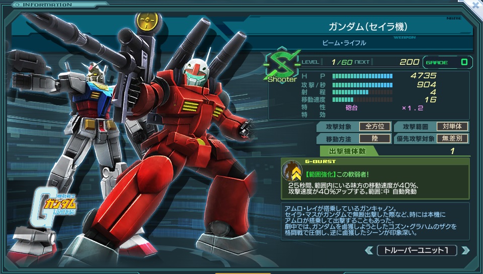 また、トルーパーとしてガンダムが付いており、移動力がガンキャノンと等速のため足並みを揃えて進軍できる。