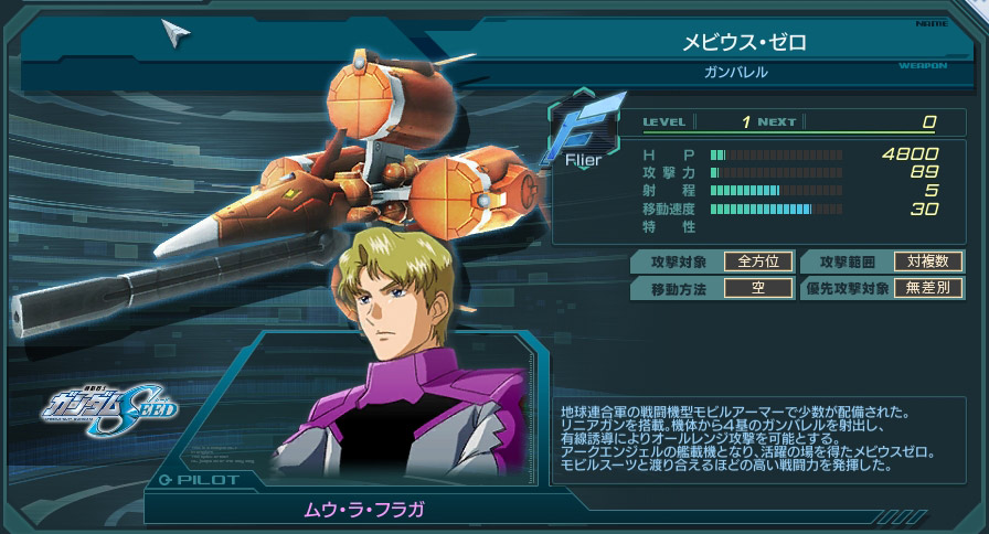 型式番号 TS-MA2mod.00 地球連合軍が開発した宇宙戦用MA。G兵器開発以前の地球連合軍において、ザフトのMS(モビルスーツ)と対等に渡り合うことができた数少ない兵器の1つ 「ガンバレル」と呼ばれる4基の有線誘導式無人機を全方位に展開・制御することで、MAの弱点である旋回性能の低さをカバーしている。 技術的にはメビウスより一世代前の機体であり、方向転換は補助バーニアの噴射によって行われるため メインスラスターの可動により方向転換を行えるメビウスとは異なる。 機首部分は切り離しができる構造であり、突入艇として単独での大気圏降下が可能となっている。 ガンバレルを扱うには突出した空間認識能力が不可欠であり、軍内ではその素質を有するパイロットの存在は希有だった。 よって人材確保の困難さからこの機体は少数生産に留まり、以後は一般兵士向けの量産機であるメビウスの生産に切り替えられた。 ガンバレルをMSに搭載するため、メビウス・ゼロをベースにした小型MA兼ストライカーパックであるガンバレルストライカーが開発され 搭載したガンバレルダガーは大戦末期に戦果を挙げている。 また、ザフト軍においてもアクタイオン・インダストリー社の協力によりドラグーンシステムを開発する。