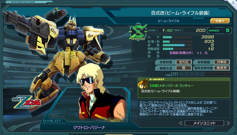 一覧 量産機 | エース | MA 最終ステータス 量産機 | エース | MA 比較データ エースGバースト | シリーズ別早見表 | 特性早見表| MS索引 赤字はレベルアップによるMAX値 基本ステータス
