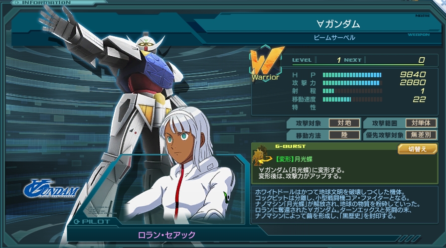 現状W型で最高性能を持つエースユニット、 最短ルートでもレアチップが累計185枚必要なのが難点。 しかし、ツリーの最終系にいるだけあって火力・耐久力全てにおいて秀でている。 Gバーストを発動すると攻撃力2倍になり、攻撃方法も3回攻撃に変化。ただし攻撃間隔は1.5秒に落ちる。