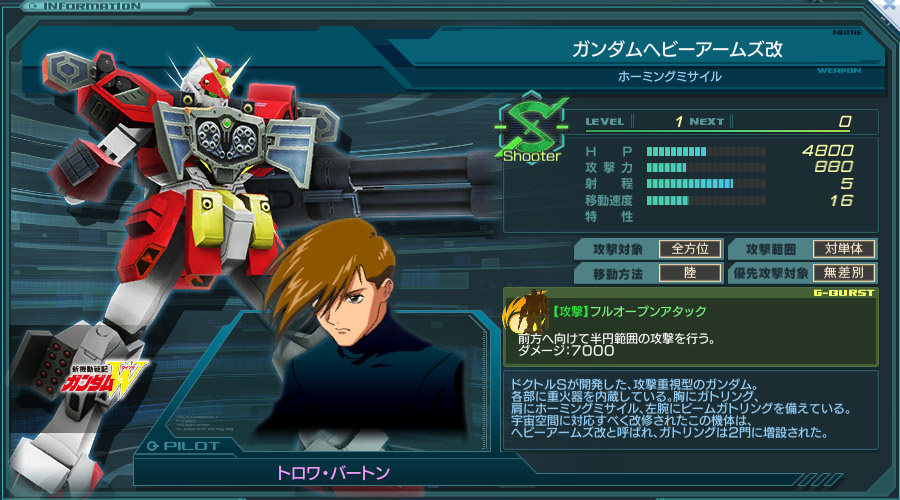 ヘビーアームズ・Gヘビーアームズ(EW版)の上位互換機。 攻撃が脚部ミサイルポッドになったためか、少々攻撃速度もアップしてる模様。 Gバーストはヘビーアームズと同じ180度範囲攻撃。EW版と違って生産特性は消えているため貯め時間への優位性はない。 ただし、攻撃間隔が長いため壊れた施設に射撃して次に行くのが遅れるところは変わってない。