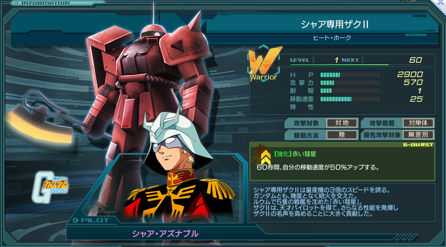 撃破時の修理時間は約1時間 バースト使用までの時間は約27秒。 ProductⅠで最初に作れるエースユニット Gバーストは自己移動加速。 Gバーストは、使いどころを間違えると、一人特攻でマトになりかねないので、よく考えて発動しよう。 後発開発のシャア専用ズゴックがステータス及び、Gバーストが範囲効果の上位互換になっている。 序盤以降、影が薄い下位互換は否めないが、予備エース、防衛エースなど型落ち後も裏方としては使い道が十二分にある。 修理時間が短いので防衛機としてどこかしらに入れておけば、エースが防衛時いない、ということも減る。