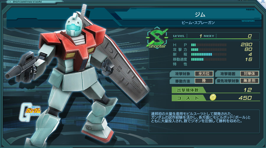 作成可能時期:コアレベル2 初期Shooterの中では後発作成なこともあってHP・攻撃ともに高い。足回りにデメリットが有るわけでもないのでコストを考慮してもオススメ出来る機体。 その後はジム・カスタムへと繋いでいくと良い。型落ち後もコスト比からその後も出番は多い。 特に壁が頑丈なマップ、S型オンリーミッションなどではザクⅡ、ジム・カスタムと共にS型で固めることもあるだろう。